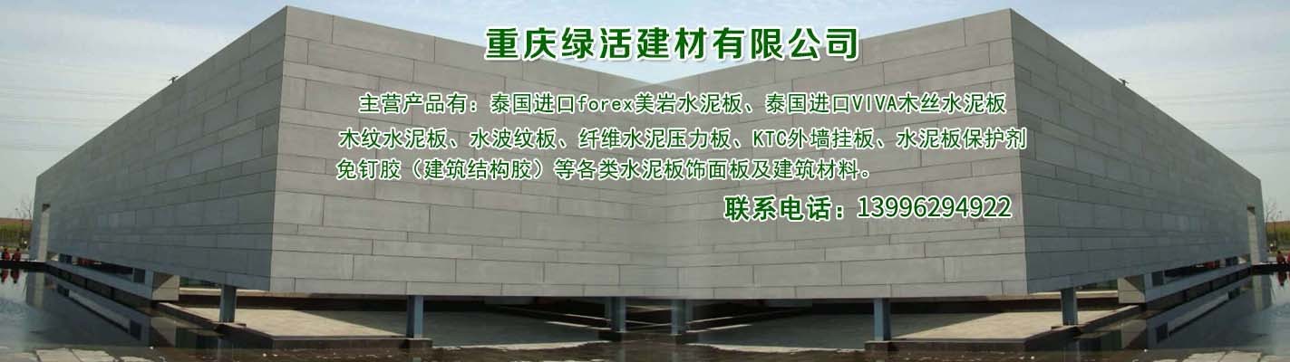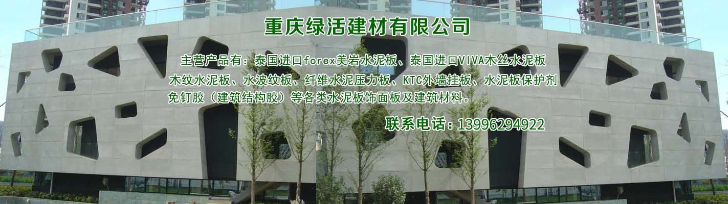 重慶綠活建材有限公司專業(yè)經(jīng)營國內(nèi)外建筑裝飾材料及防火、防水、隔音的綠色環(huán)保材料,其主營產(chǎn)品有:泰國進(jìn)口forex美巖水泥板,泰國進(jìn)口VIVA木絲水泥板,木紋水泥板,水波紋板,木絲吸音板,高密度纖維水泥板,KTC外墻掛板,水泥板保護(hù)劑,免釘膠(建筑結(jié)構(gòu)膠)等各類水泥板飾面板及建筑材料。 本公司秉承“以服務(wù)為宗旨,以誠信為本,合作至上為經(jīng)營原則”的管理理念,全力打造產(chǎn)品質(zhì)量品牌,客戶服務(wù)品牌。并致力于國內(nèi)外建材類產(chǎn)品的新工藝、新技術(shù)、新產(chǎn)品的引進(jìn)與推廣,不斷追求高品質(zhì),以卓越、優(yōu)質(zhì)的產(chǎn)品回饋社會(huì)各界的信賴與支持。